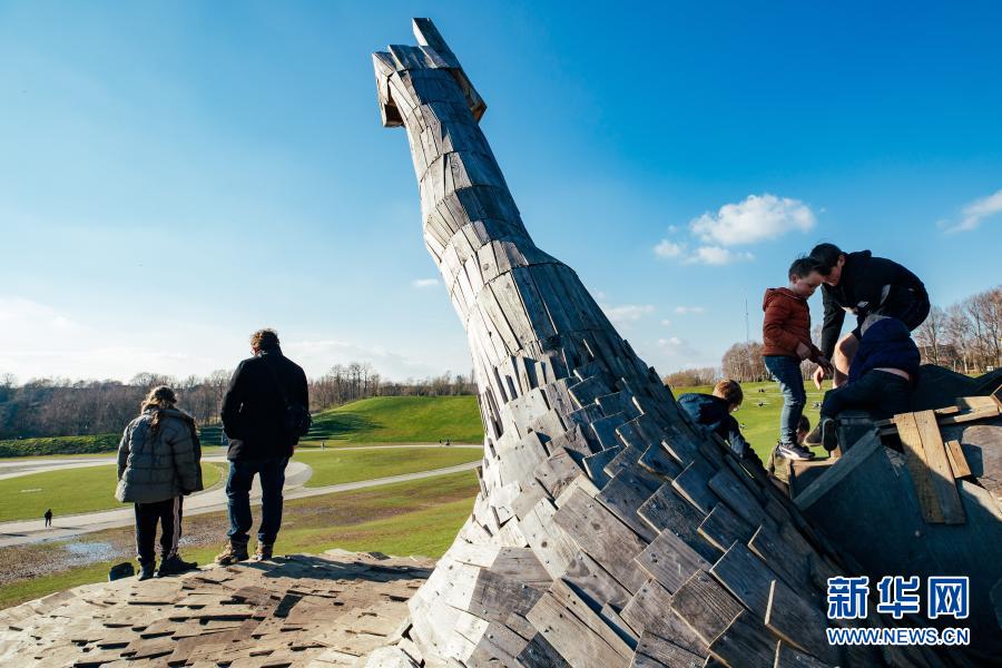 3月20日,人們?cè)诒壤麜r(shí)博姆市的德舒爾森林公園和一座“巨人”雕塑“玩?!薄P氯A社記者 張鋮 攝