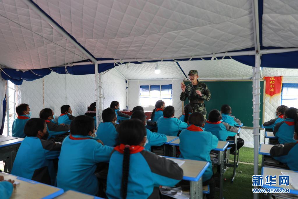 5月24日,武警青??傟?duì)果洛支隊(duì)機(jī)動(dòng)大隊(duì)排長張國睿為花石峽鎮(zhèn)藏文中心寄宿制小學(xué)的孩子上課。新華社記者 劉新 攝