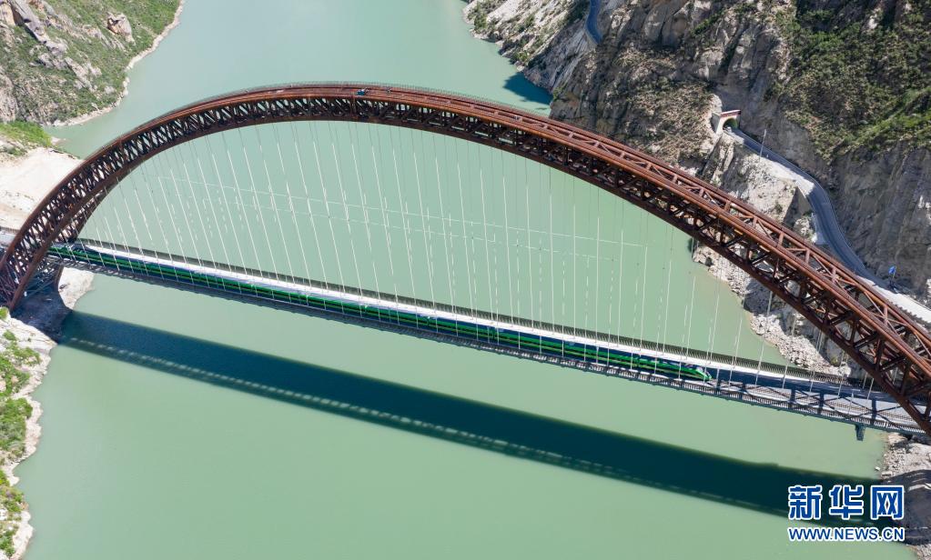 試運(yùn)行的復(fù)興號(hào)列車行駛在藏木特大橋上(6月17日攝,無人機(jī)照片)。
