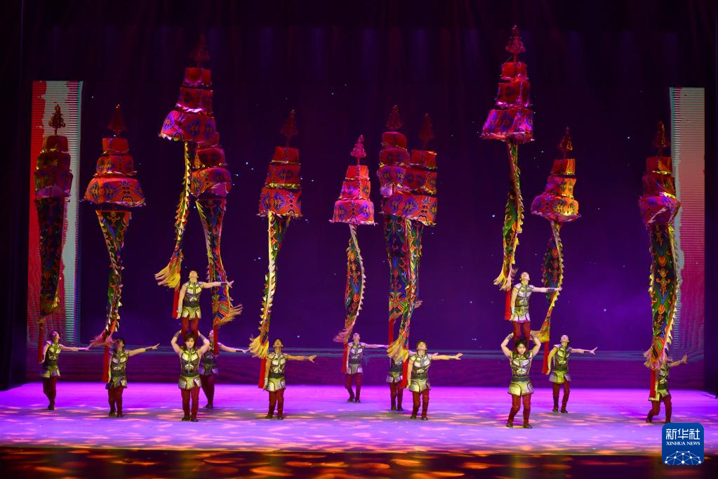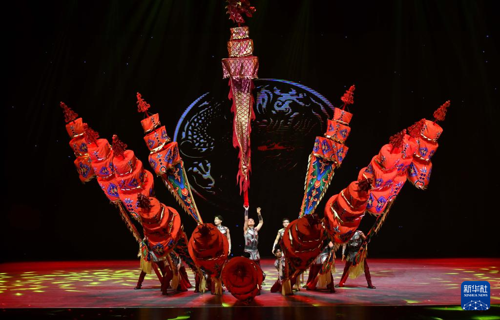3月28日,在位于山东省济南市的山东省会大剧院,演员表演杂技节目《龙跃神州·中幡》。