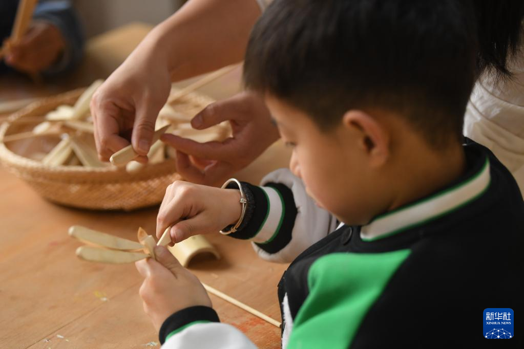 4月3日,姜鹏指导前来研学的小学生制作竹蜻蜓。