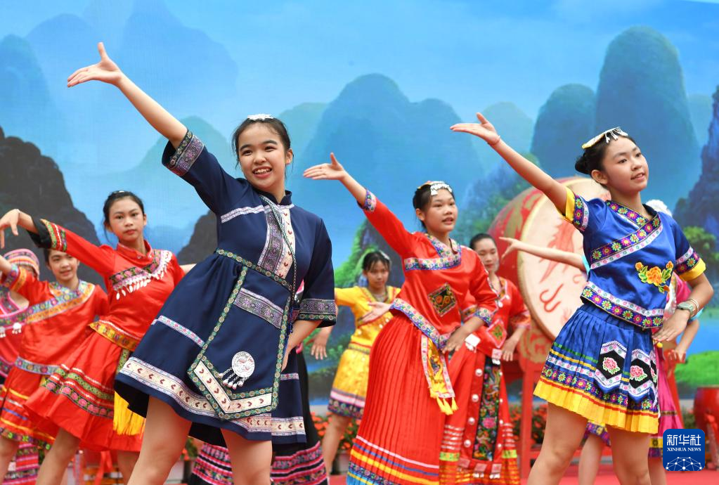 4月20日,孩子们在广西南宁市逸夫小学表演民族舞蹈。