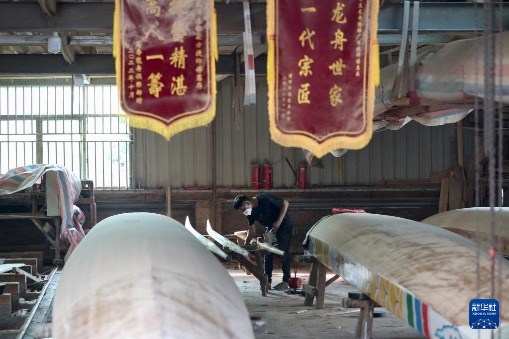 在福州市闽侯县方庄村方和猛龙舟厂,匠人在制造龙舟(6月12日摄)。