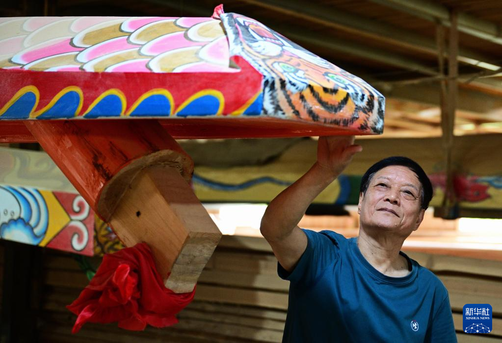 在福州市闽侯县方庄村“龙舟世家”方忠雄龙舟厂,福州市非物质文化遗产“方庄龙舟制造技艺(闽侯县)”传承人方绍晃查看传统龙舟(5月23日摄)。