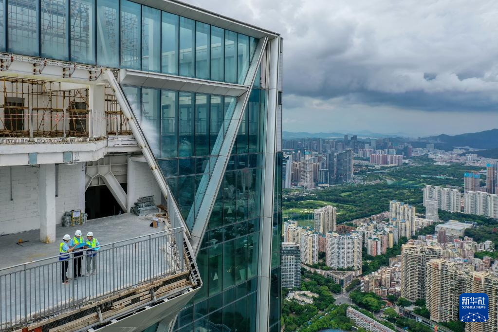 位于深圳湾超级总部的深湾汇云中心(中)66层至79层是伍涛团队在打造装饰的一家国际著名品牌酒店(无人机照片,6月26日摄)。