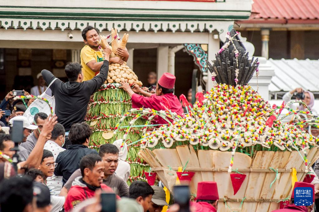 “抢山”是印度尼西亚部分地区为庆祝宰牲节举行的特色活动。人们扛着用水果、蔬菜等食物堆成的“小山”游行,并在游行结束后“争抢”食物,以此祈求节日祝福。