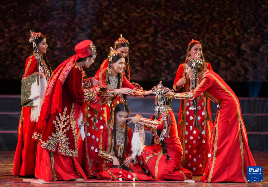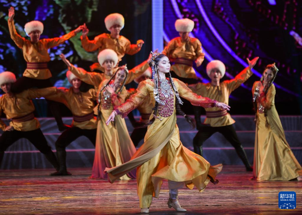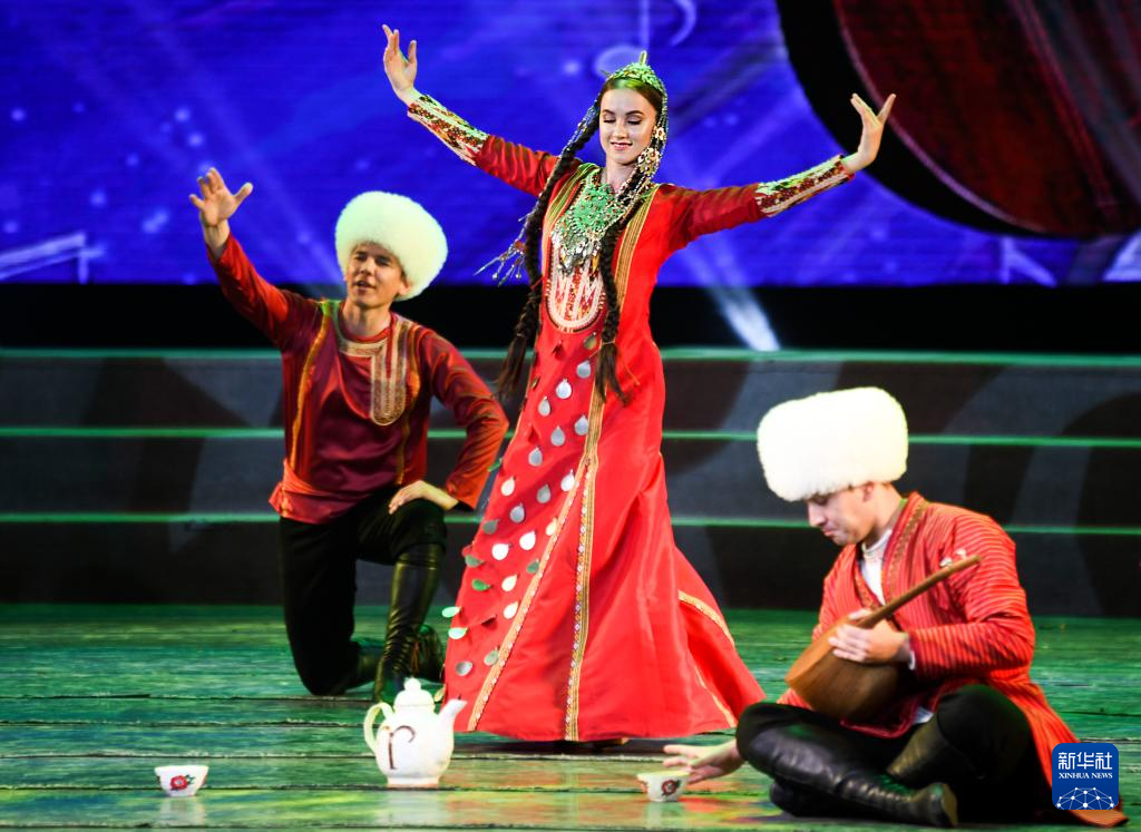 7月31日晚,在新疆人民剧场,土库曼斯坦国家舞蹈团演员在演出。
