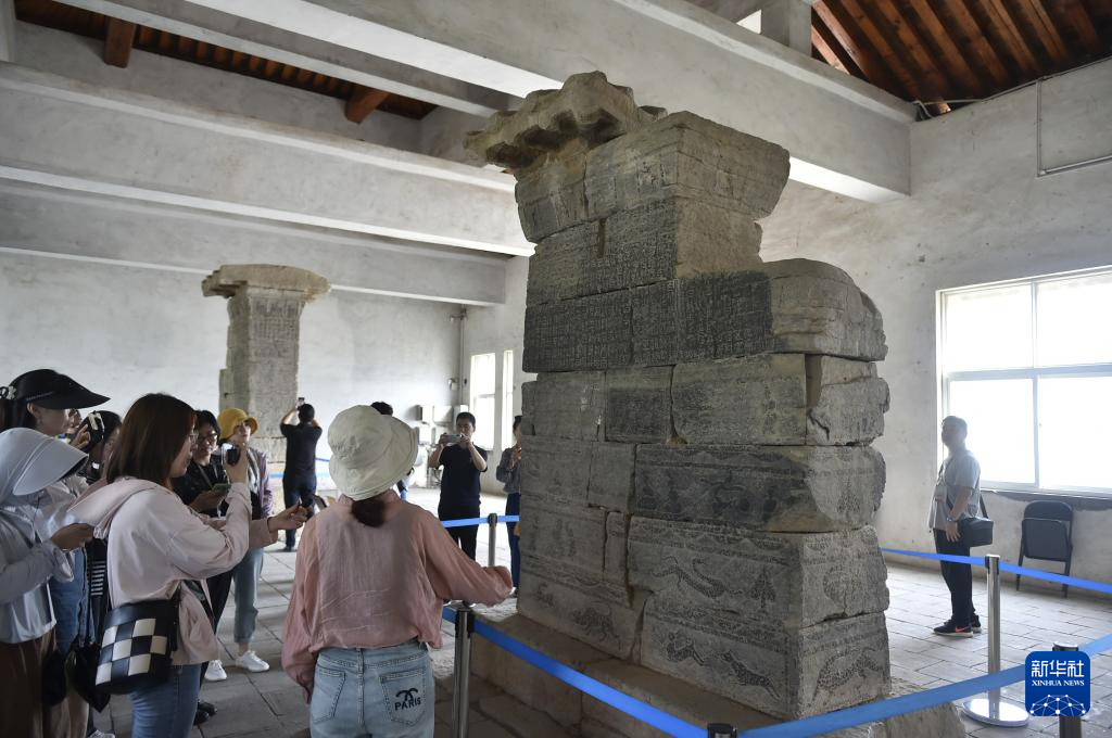 8月7日,参加集体采访活动的媒体记者参观河南登封“天地之中”历史建筑群中的观星台。