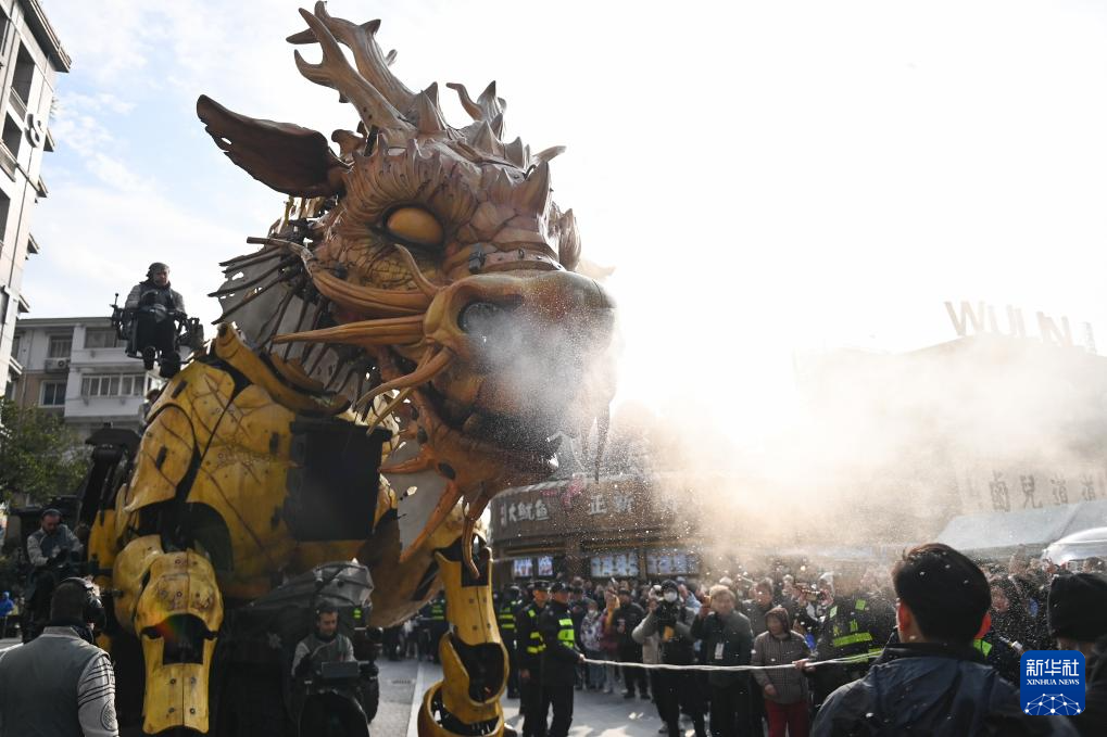 12月16日,大型机械装置艺术品“龙马精神”在武林路街区巡游。