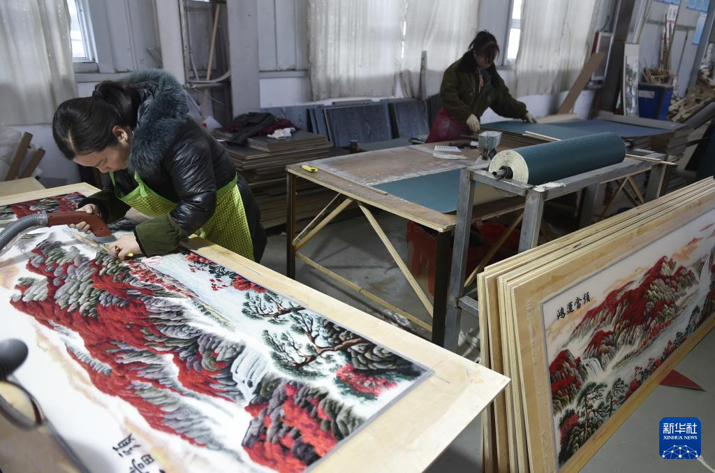 1月9日拍摄的汝州市汝绣产业园一家机绣企业的产品展厅。