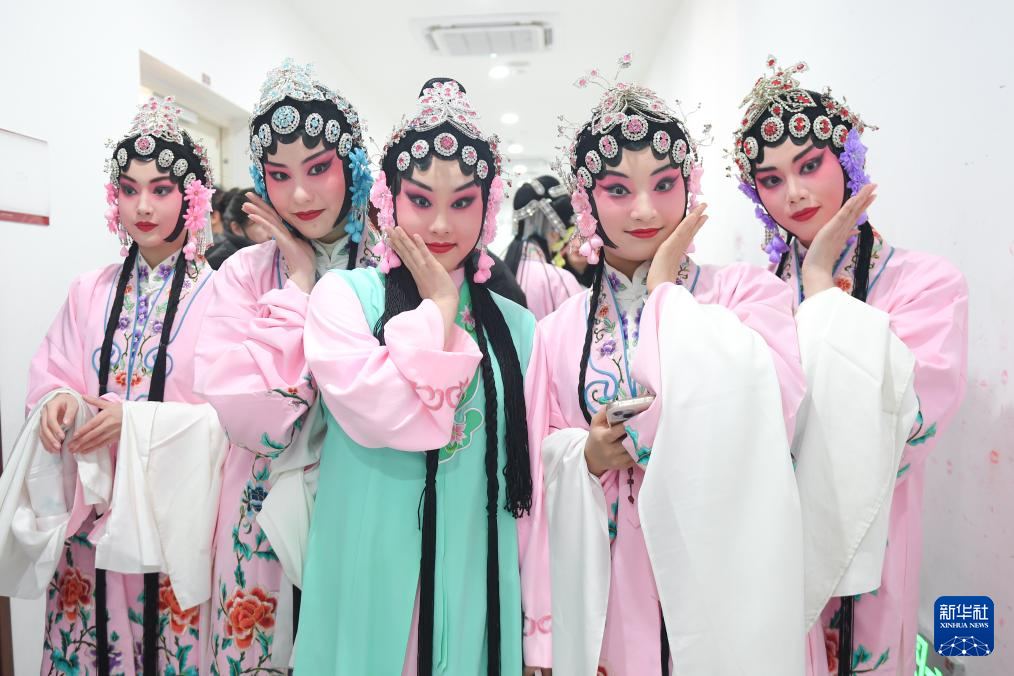 在后台的化妆室里,一群“00后”年轻演员进行着演出前的最后准备,调整妆容、戴好钗环,氛围略显紧张,又笑声不断。