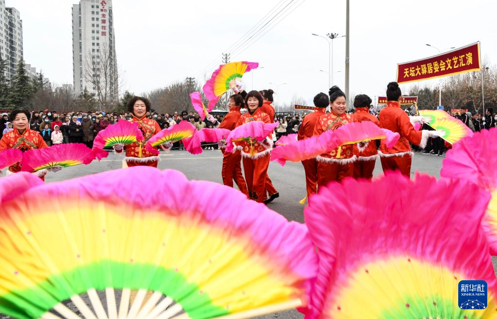 2月22日,河南省济源市天坛街道的民间艺人在表演扇子舞。