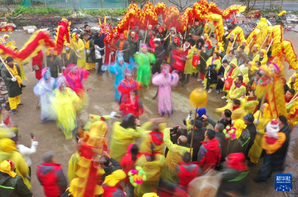 2月22日,村民在湖南省衡阳市蒸湘区呆鹰岭镇表演舞龙。