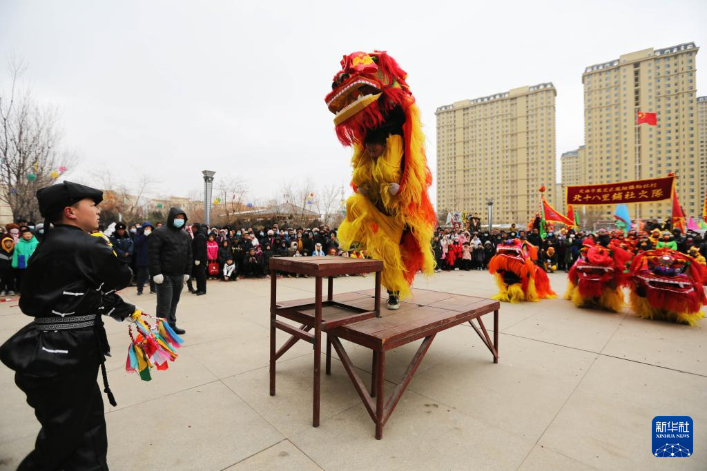 2月22日,社火队在甘肃省定西市安定区市民公园表演舞狮。