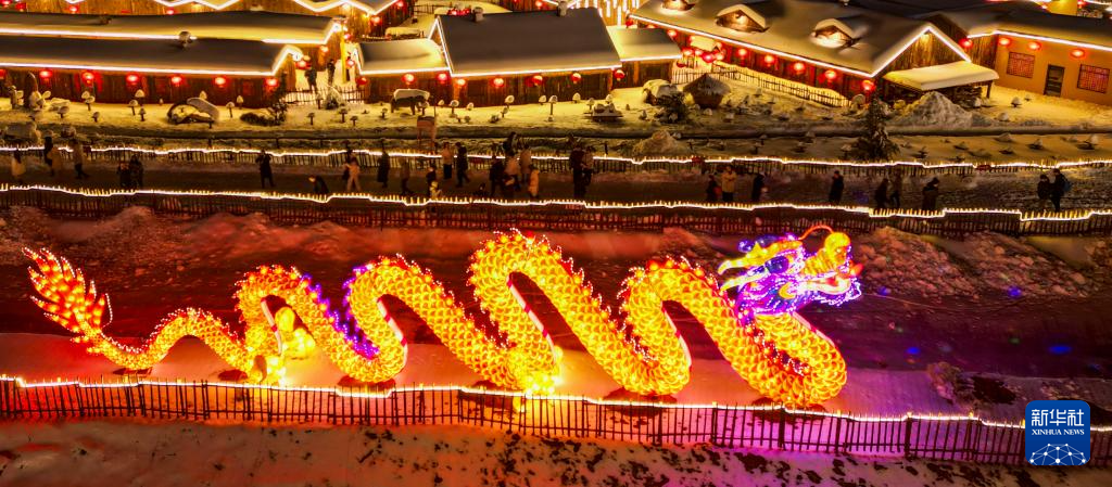 2月21日晚,在河北省遵化市山里各庄景区拍摄的龙灯和游客(无人机照片)。