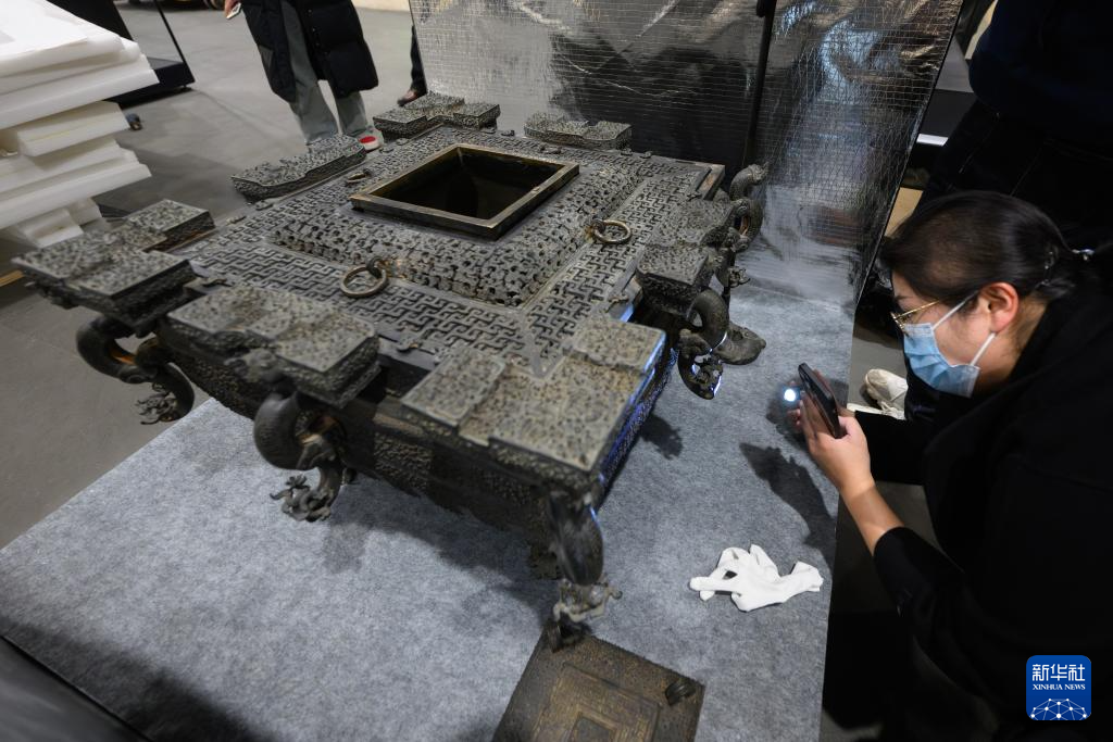 在湖北省博物馆,工作人员在对文物铜鉴缶进行点交(3月4日摄)。