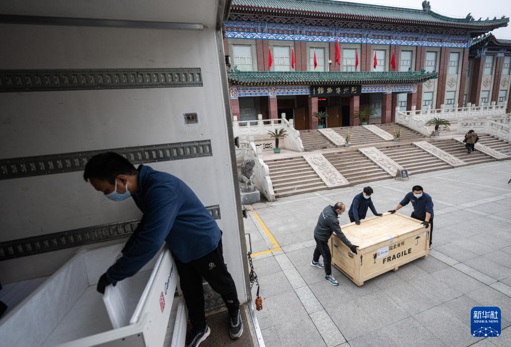 在湖北荆州博物馆,工作人员将打包好的文物装车转运(2月28日摄)。