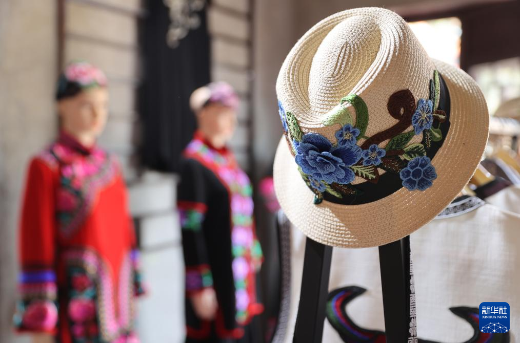 3月13日,在云南省双柏县特色产业一条街,“绣娘”在店内制作绣品。