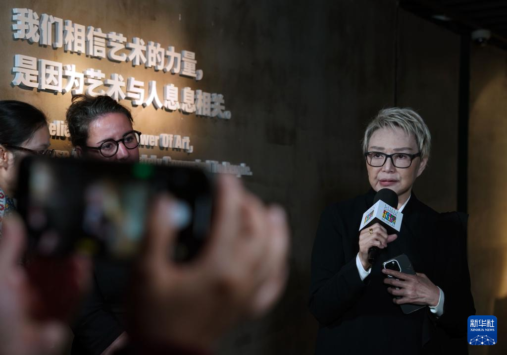 3月14日,展览策展人、上海琉璃艺术博物馆创始人杨惠姗(右)在引导媒体参观展览。