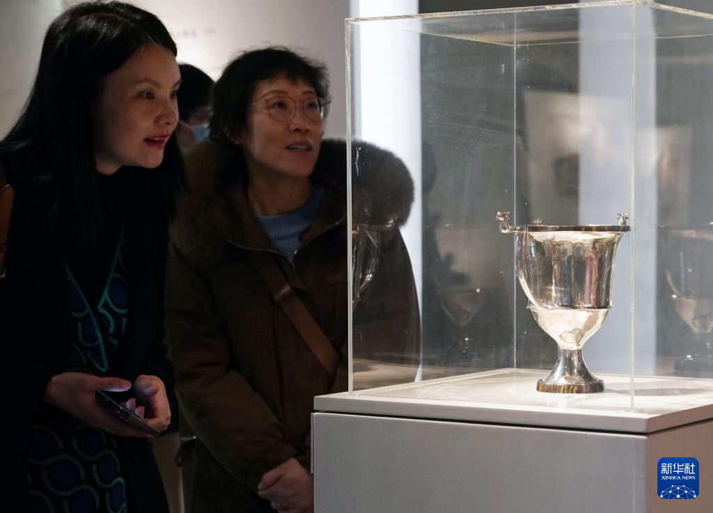 3月14日,媒体人员在观看参展作品《带着微笑的康塔罗斯酒杯》。