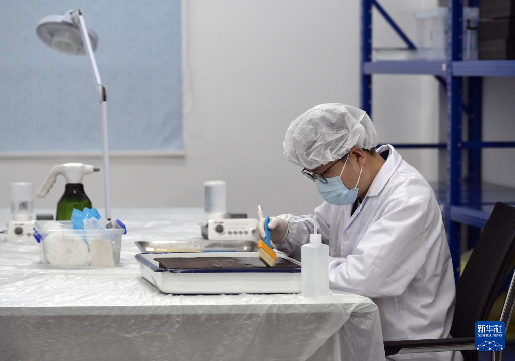 4月16日,考古工作者在武王墩考古实验室无机质保护室内进行青铜器保护工作。