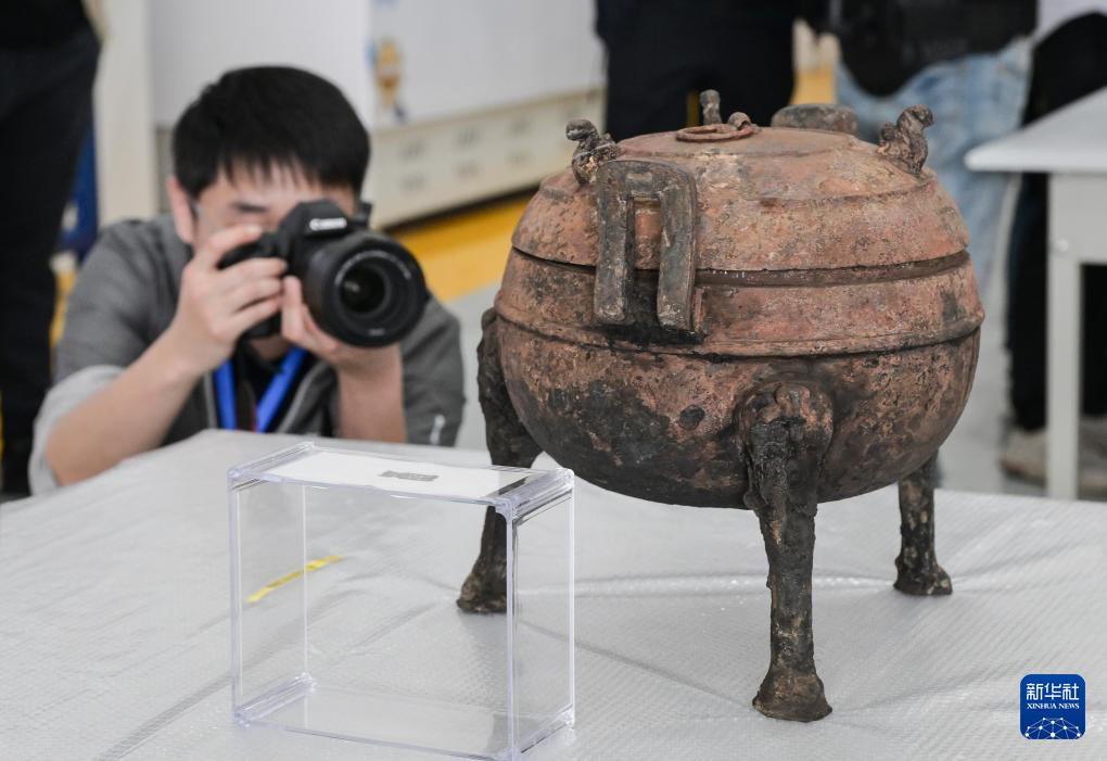 4月16日,媒体记者在武王墩墓考古实验室内拍摄一件该墓出土的附耳子母口铜鼎。