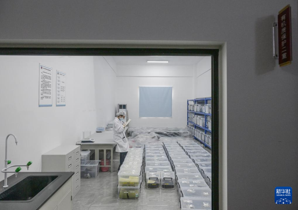 4月16日,考古工作者在武王墩考古实验室有机质保护室内对出土木俑做保护工作。