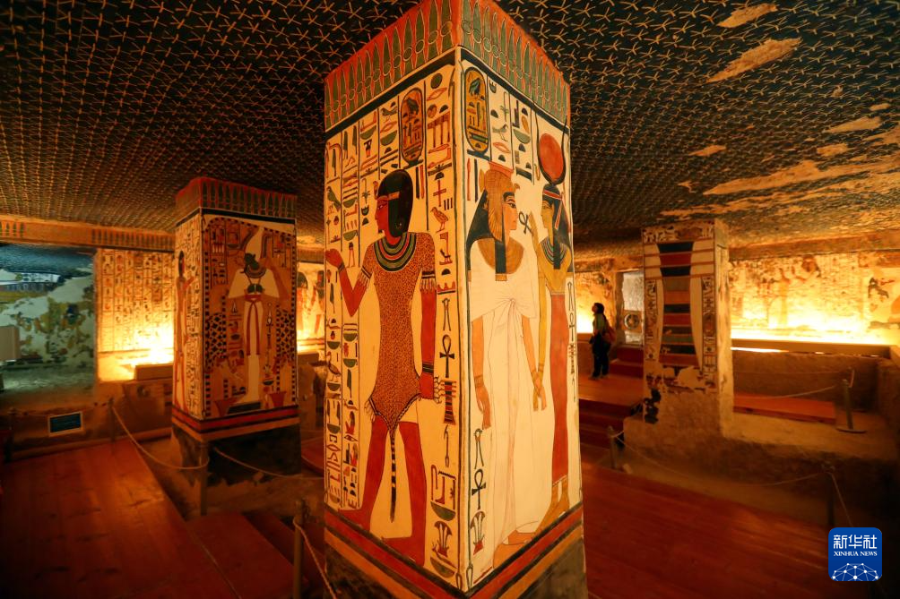 这是2023年1月24日在埃及卢克索王后谷拍摄的奈菲尔塔利地下陵墓壁画。