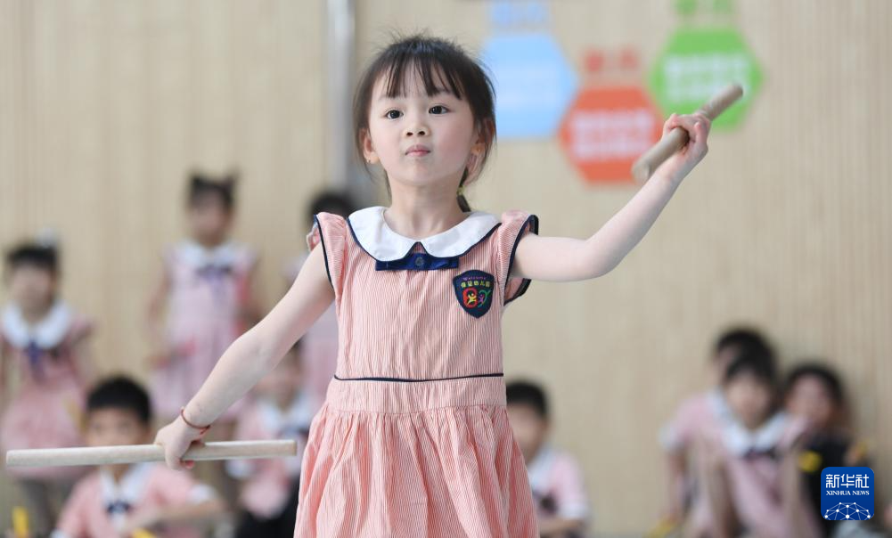 5月29日,在汕头市贵屿镇北林保婴幼儿园,庄恩琪练习跳英歌舞。