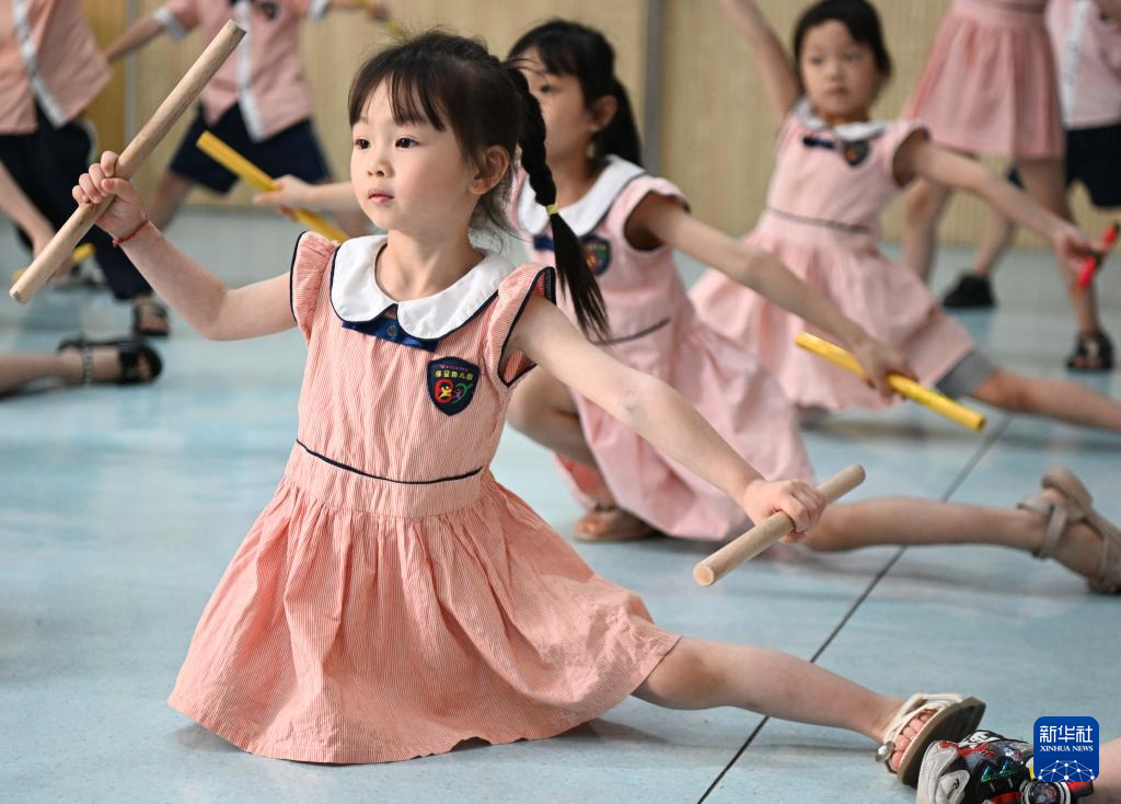 5月29日,在汕头市贵屿镇北林保婴幼儿园,庄恩琪(前左)在练习跳英歌舞。