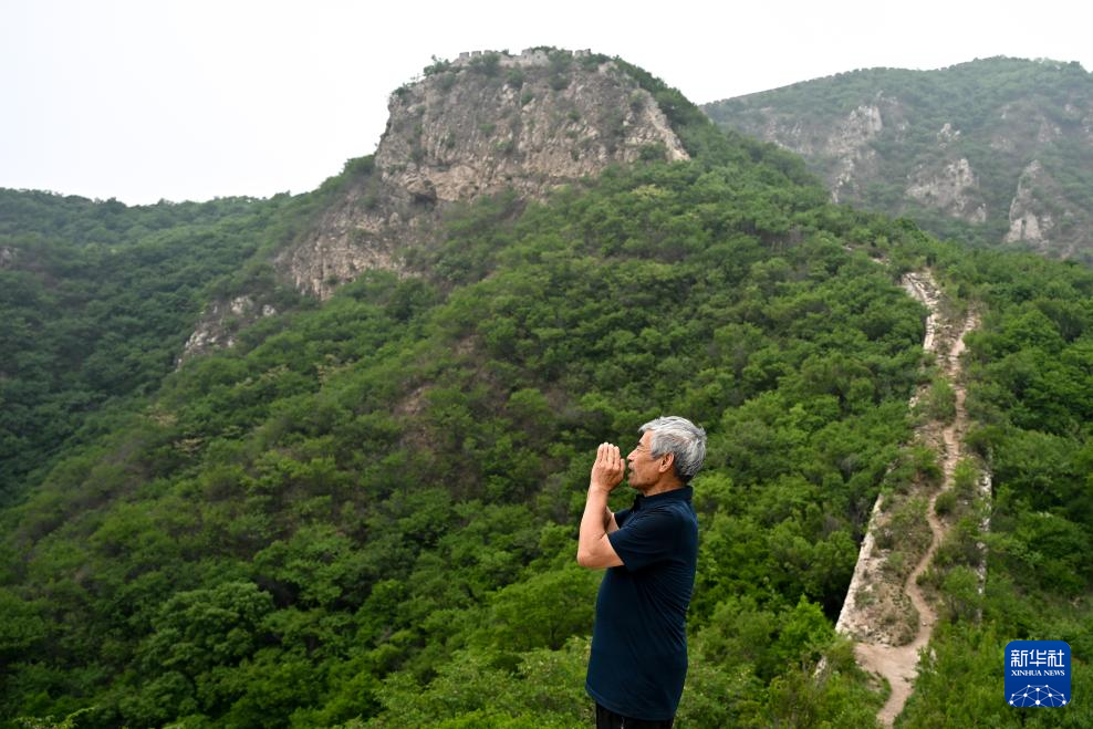 80岁的长城保护员梅景田在石峡村的明长城上(5月23日摄)。上世纪80年代初,梅景田开始自发保护长城,已带动不少村民形成保护长城的意识。