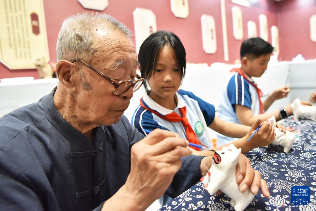 6月8日,在山东潍坊高密市姜庄镇泥塑文化艺术馆,聂家庄泥塑艺人在演示点彩技巧。