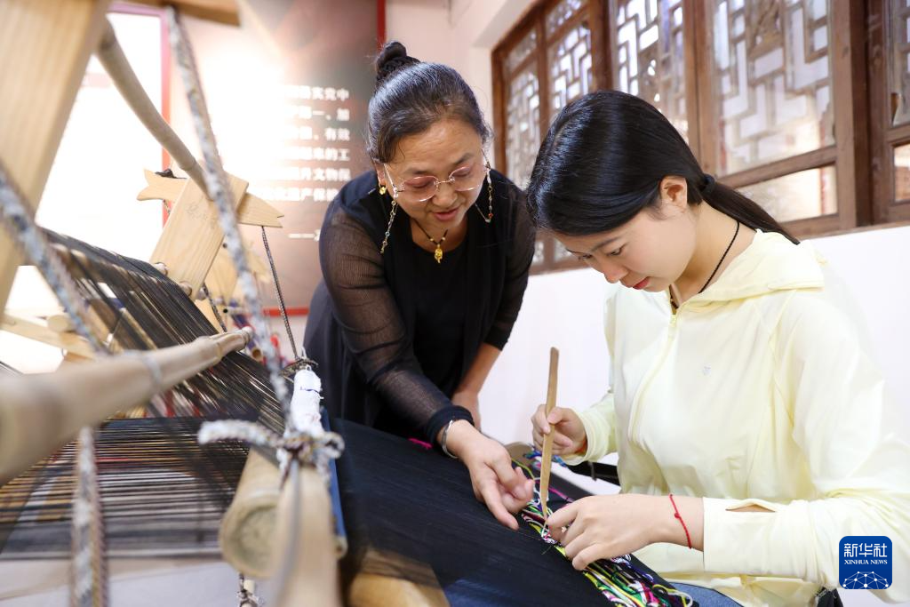 6月8日,在位于重庆市黔江区濯水古镇的渝东南非物质文化遗产馆,游客(右)体验编织土家族西兰卡普。