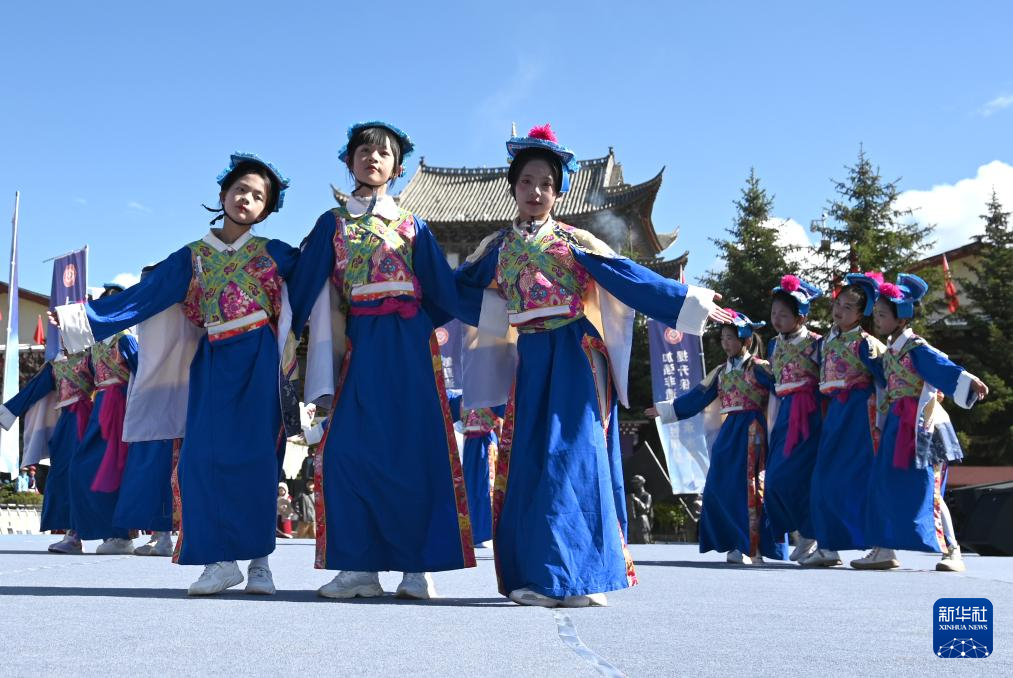 6月8日,云南省迪庆藏族自治州在香格里拉市举行迪庆州非遗集中展示活动,当地小学生在舞台上表演迪庆锅庄舞。