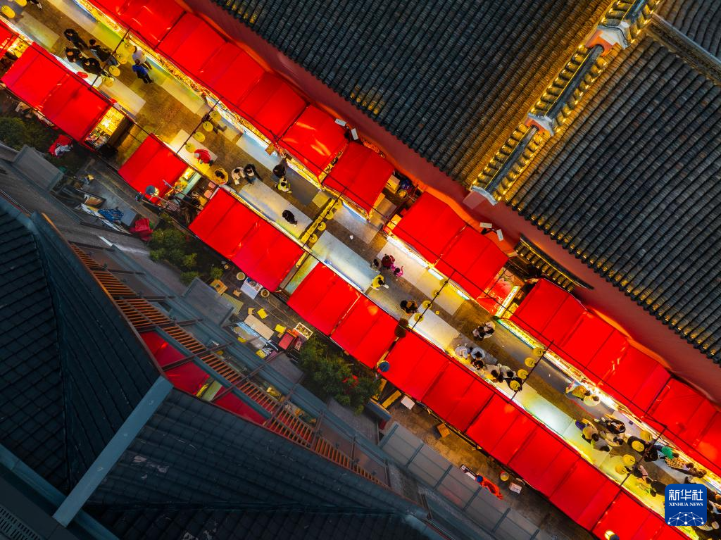 1月18日,游人在浙江省宁波市逛城隍庙夜市(无人机照片)。