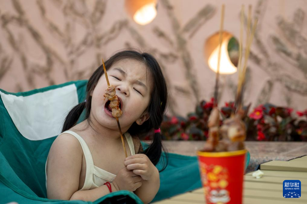 7月1日,小朋友在乌日贡主题活动现场品尝烤串。