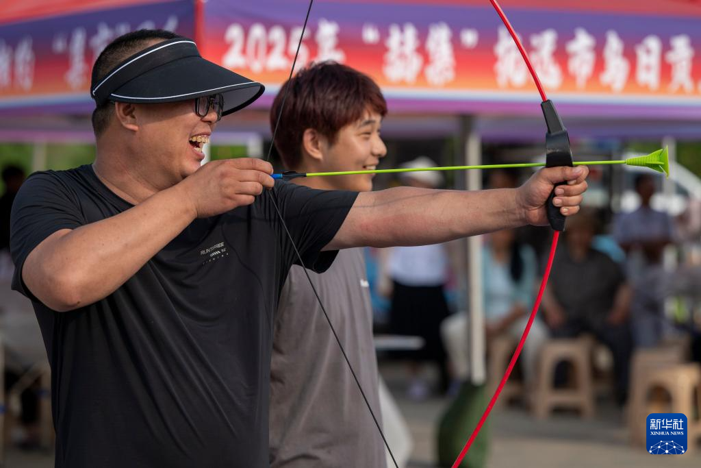 7月1日,人们在乌日贡主题活动现场体验乌日贡大会的传统体育项目。