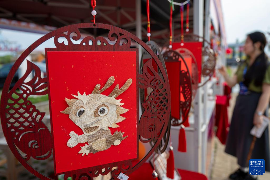 7月1日,游客在“华夏东极”黑龙江省抚远市乌苏镇莫日根广场挑选赫哲族鱼皮手工艺品。