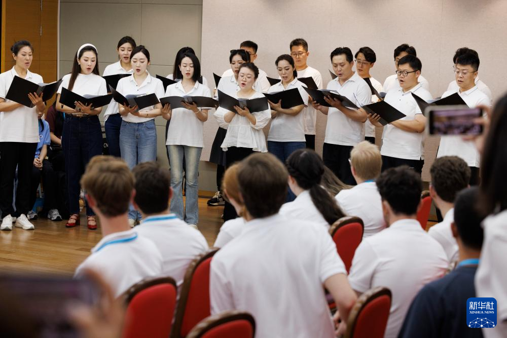 7月14日,在中国交响乐团,犹他谷大学合唱团、河北省正定中学合唱团等团员在观看乐团排练。