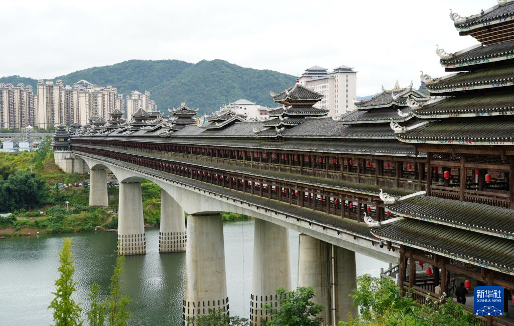 这是9月25日拍摄的三江侗族自治县的程阳永济桥。该桥建成于1924年,整座桥梁搭建时不用一钉一铆,主要由木料和石料建成,桥长近80米,宽近4米,高近12米,是我国建筑艺术中的珍品。