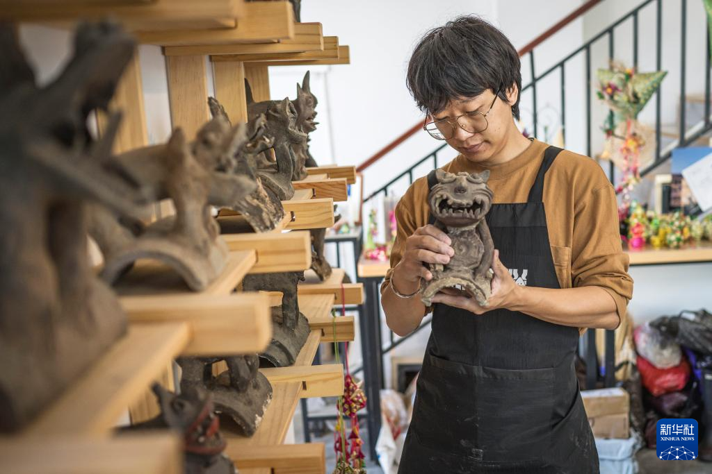 捧起泥土,反复搓揉、捶打;竹刀轻走,刻出须纹与爪印;阴干定型,入窑烧制;过程中全无图纸,也无模样,仅凭心中的所想。工作间内,张航尝试调整瓦猫姿态、改变头身比例,思索在旧工艺上创造新表达。“瓦猫的肚腩要留空,口尾相通,保留‘吞进不好的、排出有益的’寓意,让新瓦猫依然肩负传统的使命。”