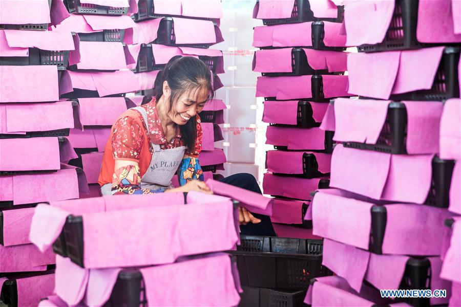 A farmer packs cherry tomatoes in Dafang County of Bijie, southwest China's Guizhou Province, July 18, 2018. Farmers in Bijie County are busy collecting cherry tomatoes during the harvest season. (Xinhua/Luo Dafu)