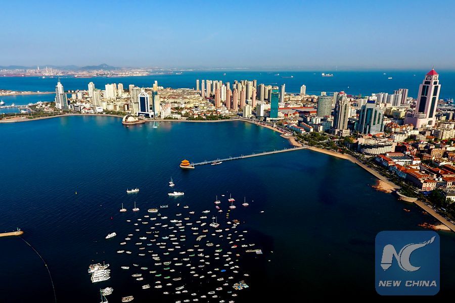 Aerial photo taken on May 4, 2018 shows the Zhanqiao Pier and the Qingdao Bay in Qingdao, east China's Shandong Province. (Xinhua/Guo Xulei)