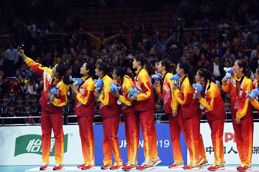 Team China takes a selfie during the awarding ceremony of the women's volleyball gold medal match at the 7th CISM Military World Games in Wuhan, capital of central China's Hubei Province, Oct. 22, 2019.(Xinhua/Fan Peishen)