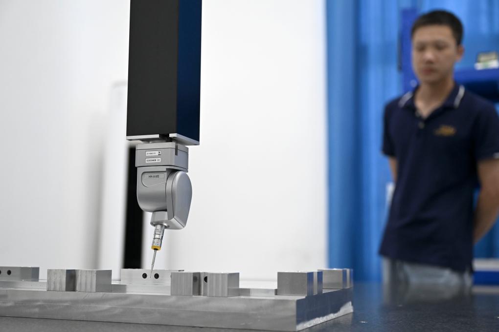 A staff member measures aviation components at Anhui Feiyue Aviation Technology Co., Ltd. in Wanzhi Town of Wuhu City, east China's Anhui Province, Aug. 21, 2025. (Xinhua/Huang Bohan)
