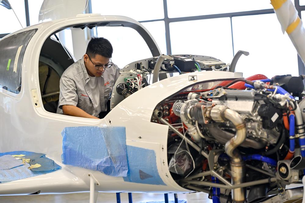 A staff member assembles a general aviation aircraft at CETC Wuhu Diamond Aircraft Manufacture Co., Ltd. in Wanzhi Town of Wuhu City, east China's Anhui Province, July 3, 2025. (Xinhua/Zhang Cheng)