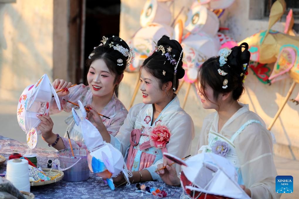 Tourists make festive lanterns at Hongcun Village of Yixian County, Huangshan City, east China's Anhui Province, Oct. 5, 2025. Yixian County is noted for its "lantern gala," an important folk event held during traditional festivals. (Photo by Fan Chengzhu/Xinhua)