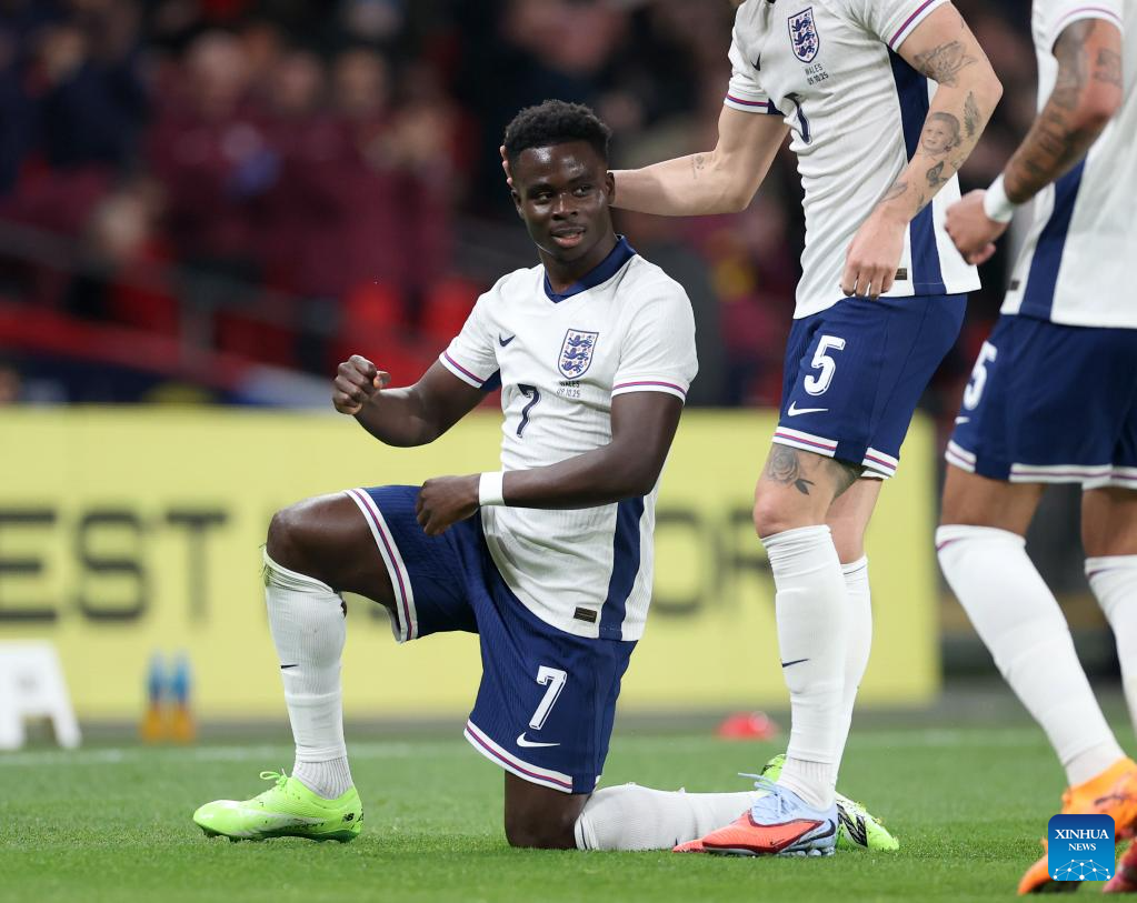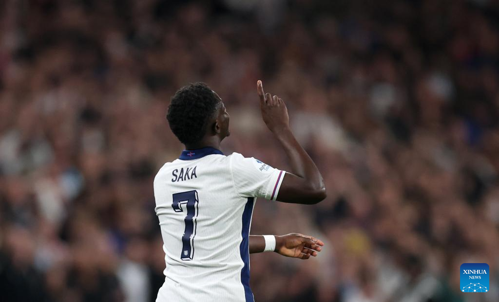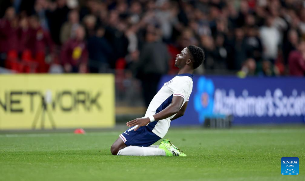 England's Bukayo Saka celebrates scoring his side's third goal during a friendly football match between England and Wales at Wembley Stadium in London, Britain, Oct. 9, 2025. (Xinhua/Li Ying)