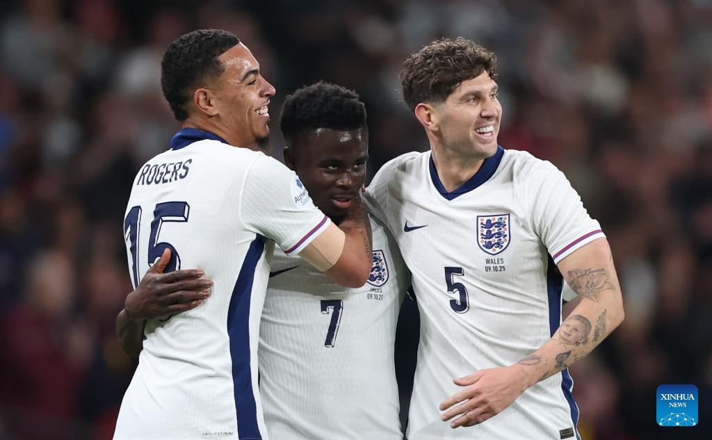England's Bukayo Saka (C) celebrates scoring his side's third goal with his teammates Morgan Rogers (L) and John Stones during a friendly football match between England and Wales at Wembley Stadium in London, Britain, Oct. 9, 2025. (Xinhua/Li Ying)
