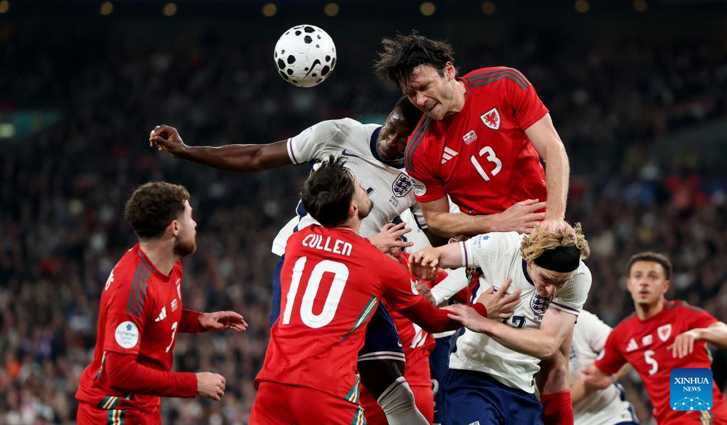 England's Marc Guehi (top L) vies with Wales' Kieffer Moore for a header during a friendly football match between England and Wales at Wembley Stadium in London, Britain, Oct. 9, 2025. (Xinhua/Li Ying)
